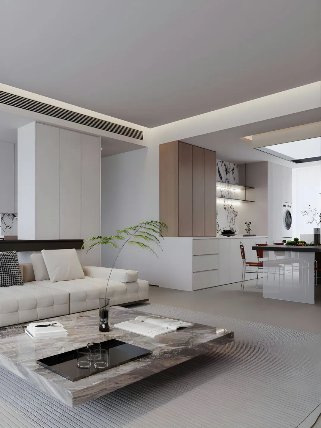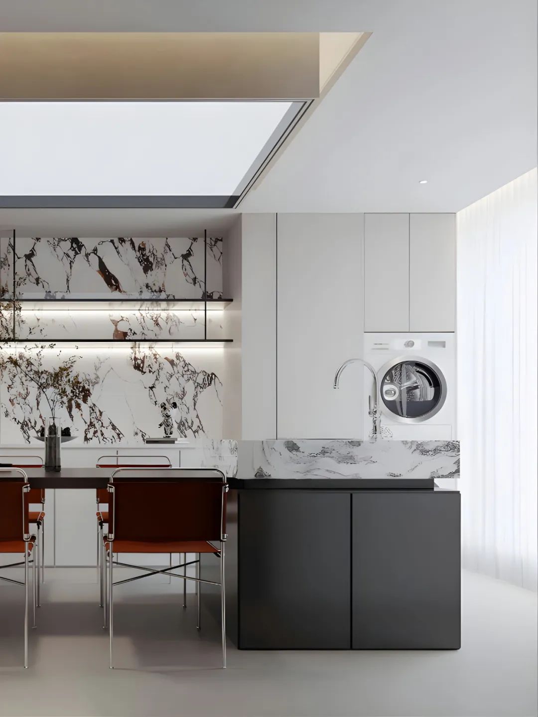 看看這大理石的茶幾,質(zhì)感拉滿,隨手放本書、一杯咖啡,氛圍感這不就有了。開(kāi)放式廚房和餐廳連在一起,